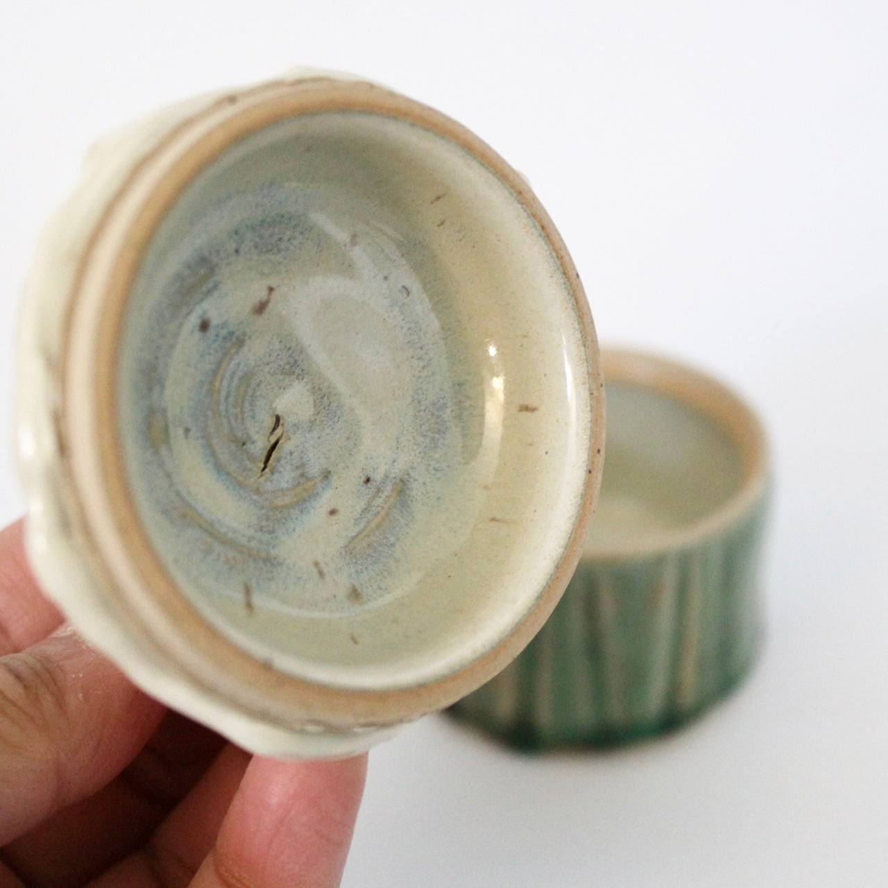 This small ceramic cupcake box is wheel-thrown and topped with a sculpted dog biscuit treat, finished with soft piped clay "frosting" on top. The outside features a pale green confetti-style glazing, giving it a playful, sprinkle-like charm. Open the lid to reveal a pale mossy green interior - fresh, cozy, and perfect for holding treats, trinkets, or tiny treasures.