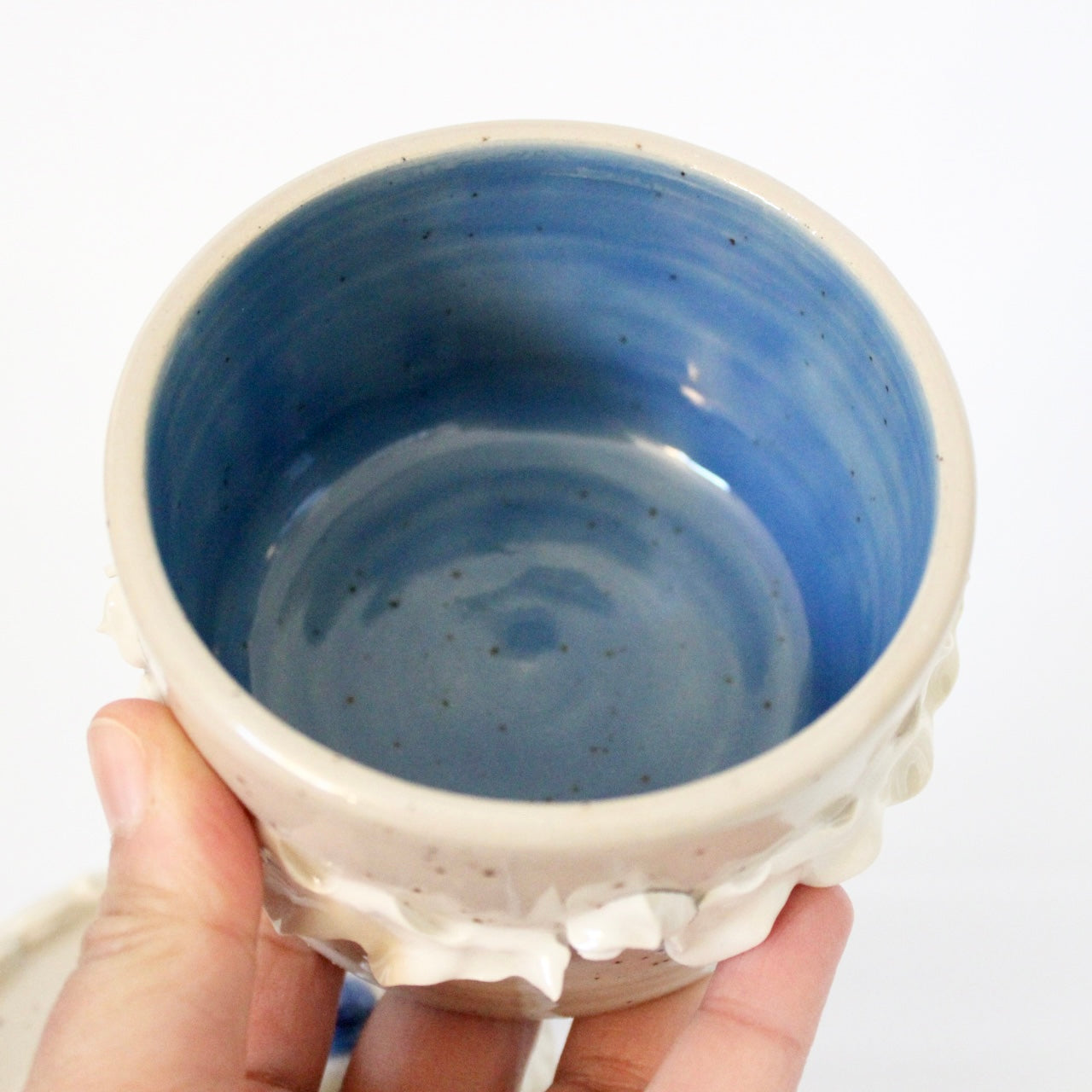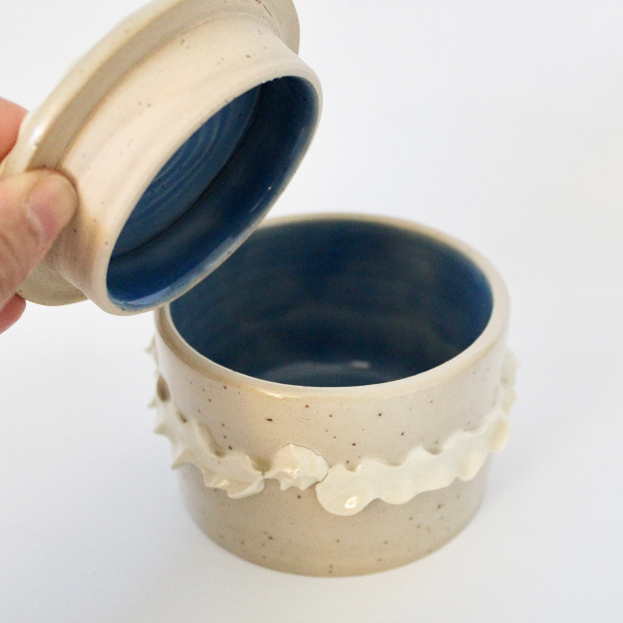 Lift the lid to reveal a glossy, sky-blue interior glaze - perfect for holding sugar, jewelry, matches, or any small treasures that deserve a beautiful home.