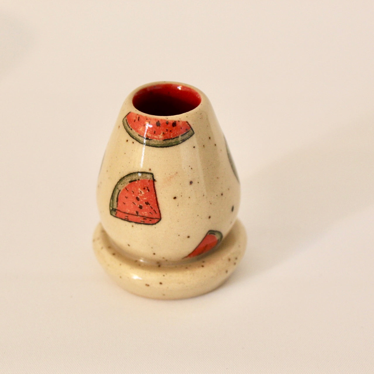 This handmade matcha bowl and whisk holder set features a playful watermelon illustration inspired by summer harvests and slow, intentional rituals. Thoughtfully crafted for both beauty and function, the bowl offers a comfortable shape for whisking while the coordinating holder helps preserve your chasen between uses.